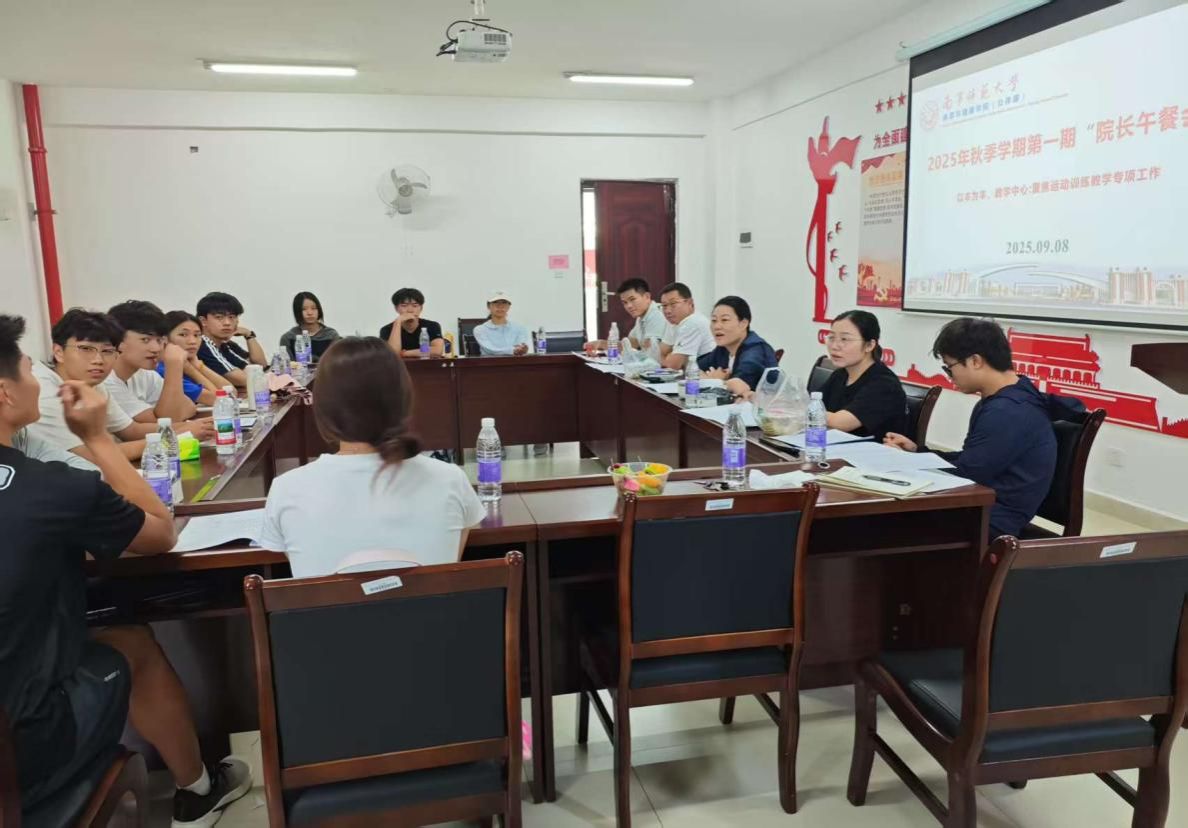 以“以本为本,教学中心:聚焦运动训练教学专项工作”为主题,举办了一场别开生面的院长午餐会。赵芳院长、专业负责人顾大成老师、青年教师级班主任代表尹兆松、王志元,以及12名运动训练专业学生代表共同参与。活动由院长助理马泓宇主持。