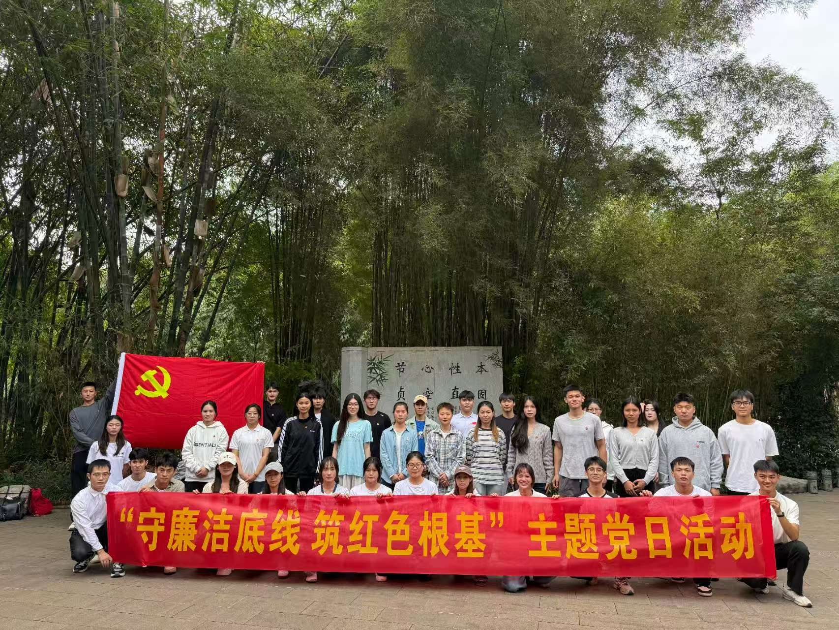 37位学生党员在支部书记于宇航老师的带领下赴青秀山风景区廉洁教育基地,开展“守廉洁底线,筑红色根基”主题党日活动,以实地教育推动廉洁教育入脑入心。