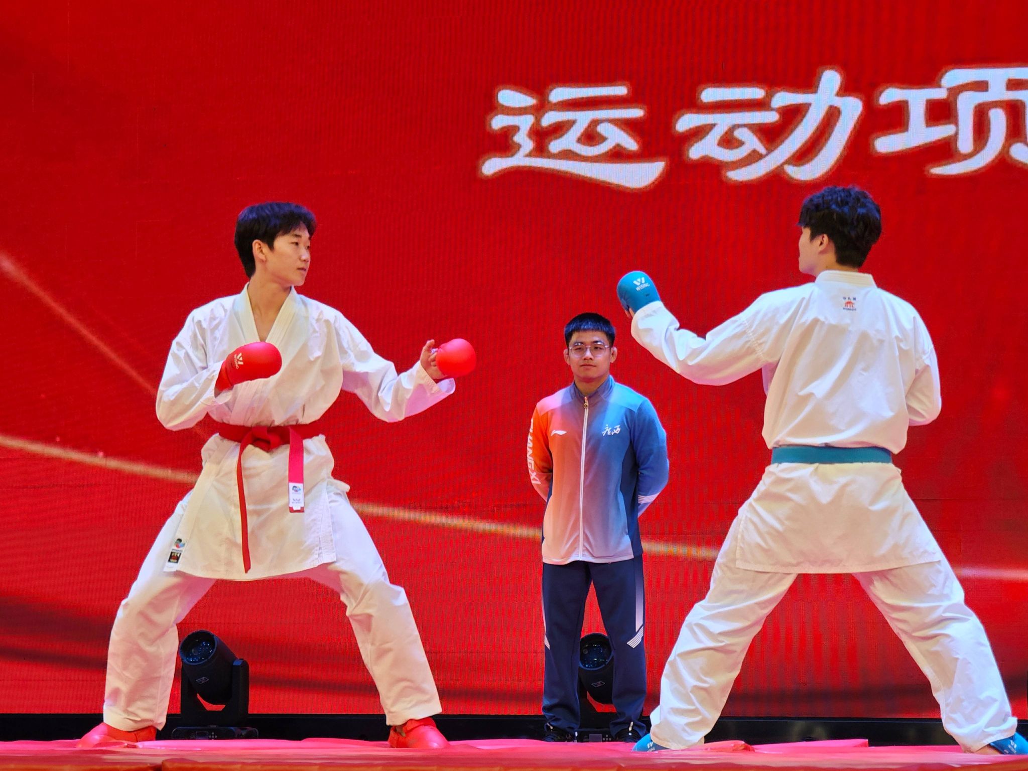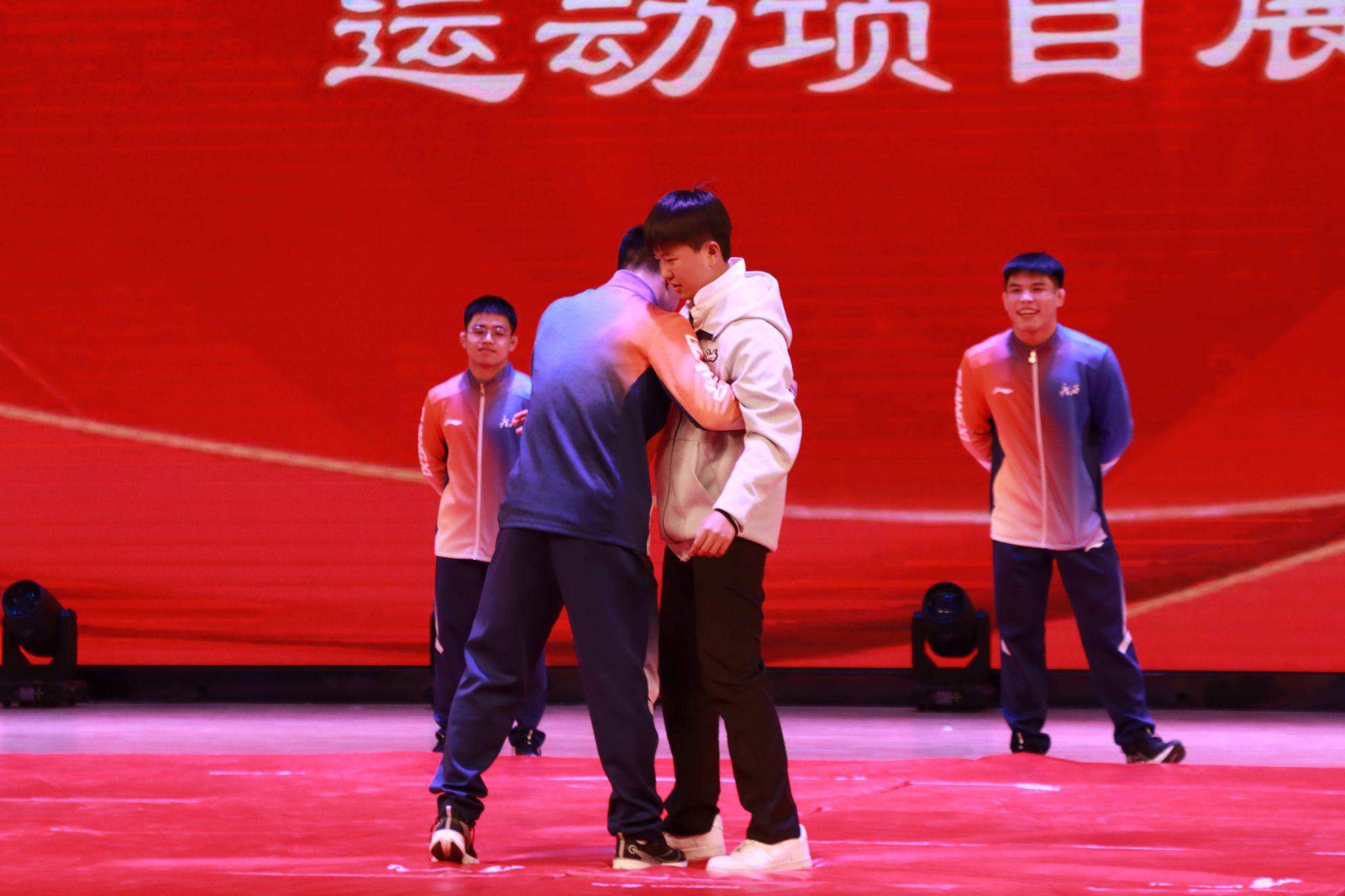 互动环节将现场气氛推向高潮。多名学生在赵芳院长的邀请下登台,在冠军指导下亲身体验摔跤动作。冠军们耐心讲解、亲身示范,报告厅化身为充满热情与活力的互动课堂。随后的运动项目展演环节,运动员们相继展示了摔跤、柔道、空手道、拳击、跆拳道五个项目的技术动作与对抗演示,扎实的基本功与流畅的攻防转换,引来阵阵掌声,充分展现了重竞技运动的多样魅力。