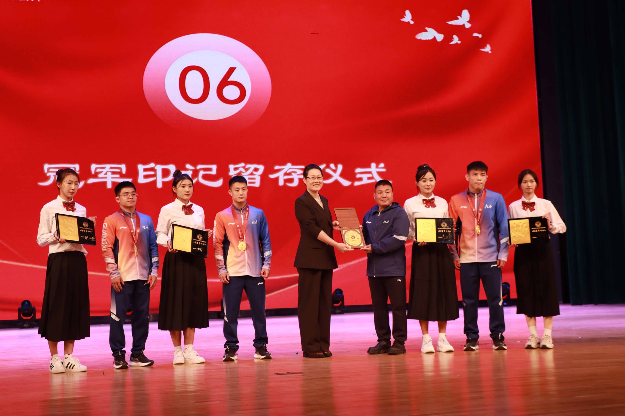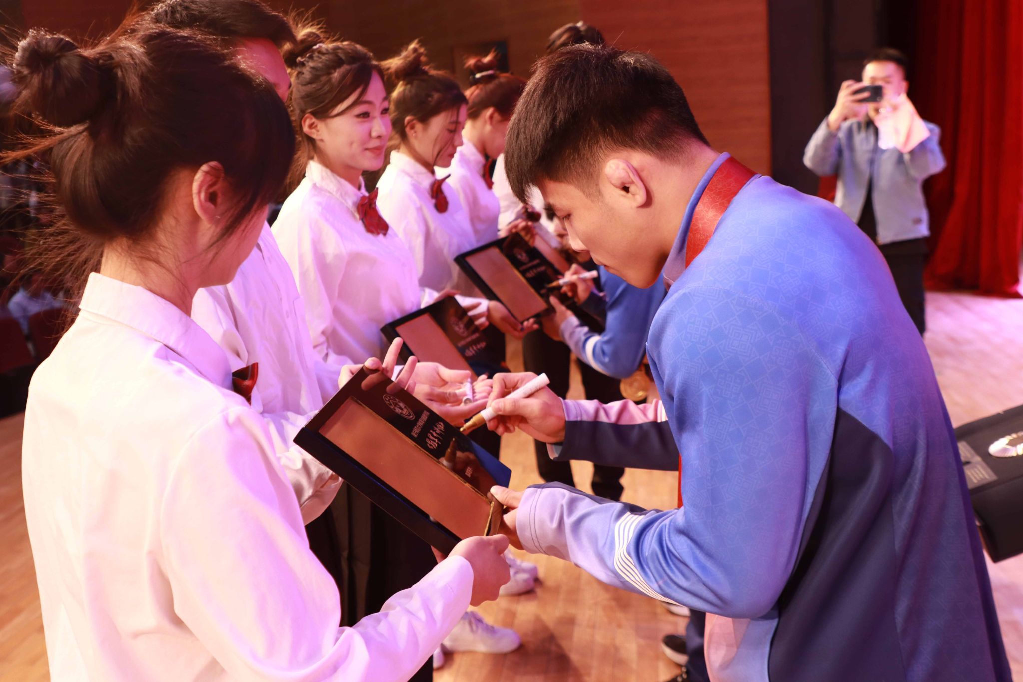 活动最后,冠军们将手印留存,学生们有序排队与冠军合影。冠军们始终微笑回应,现场温馨而有序。此次“零距离”接触,不仅让学子感受到体育明星的亲和力,更在他们心中播下了勇于挑战、不懈奋斗的种子。