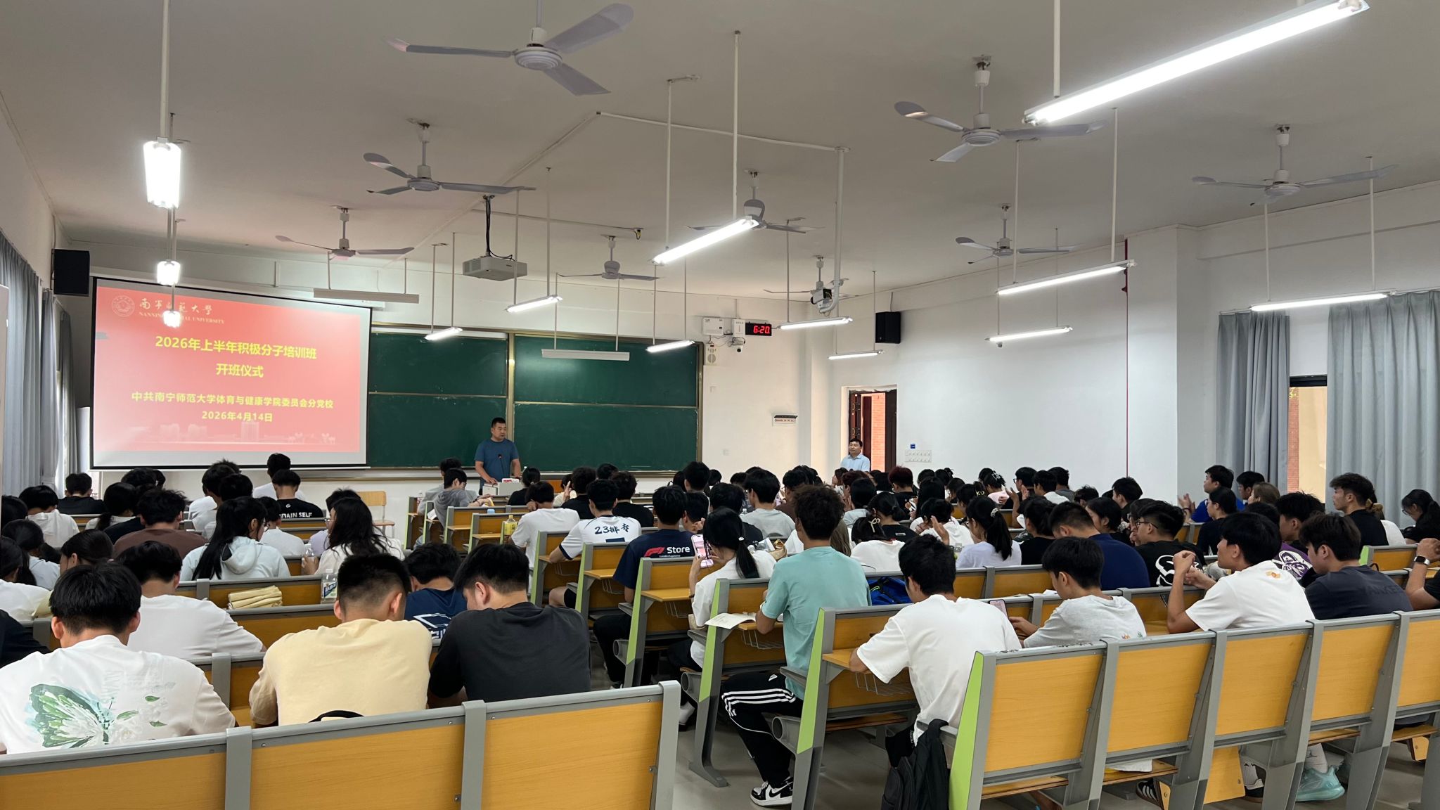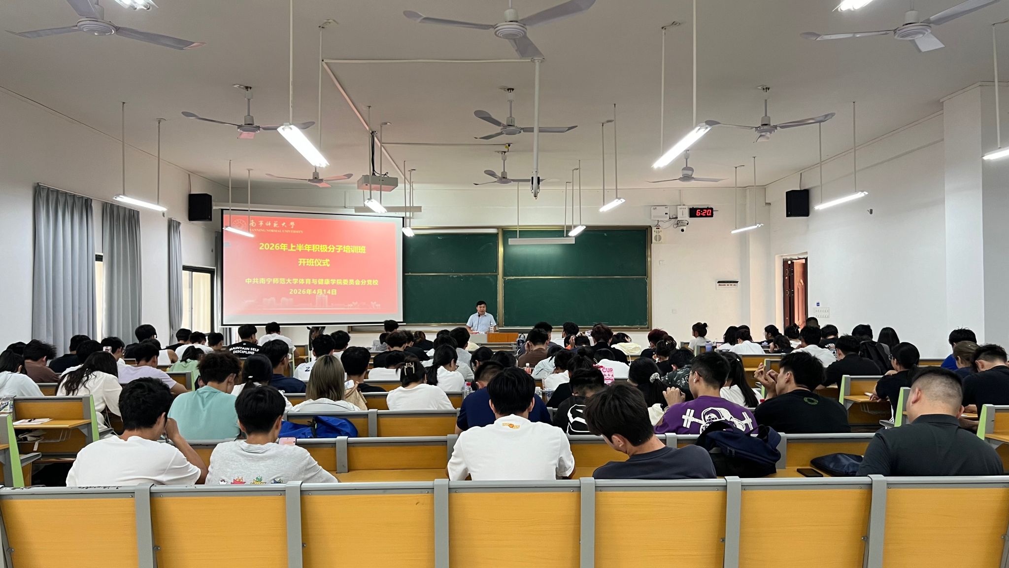 于2026年4月14日在武鸣校区实验楼2-A102举行学院2026年上半年入党积极分子培训班开班仪式及第一课。学院党委副书记(主持党委工作)韦良老师、组织员乔学富老师、支部书记于宇航老师出席会议,学院2025年下半年及2026年上半年积极分子78人参加党课。